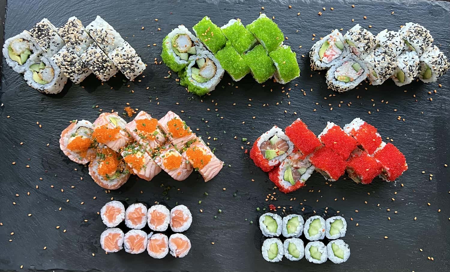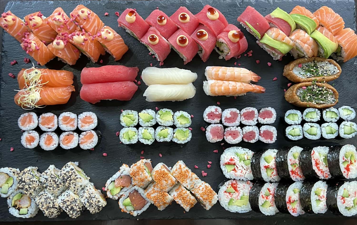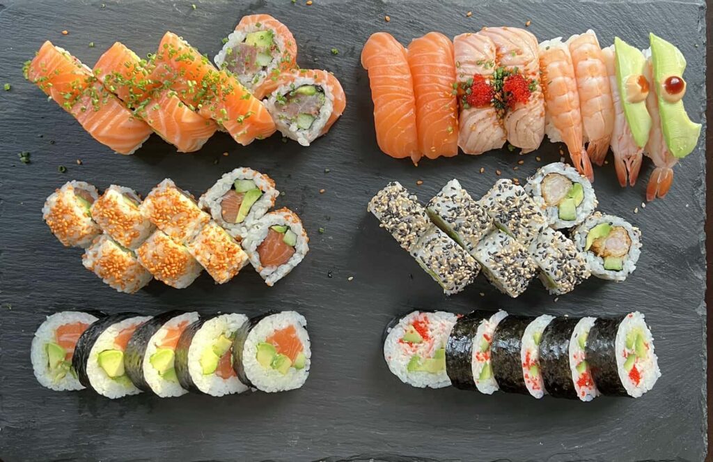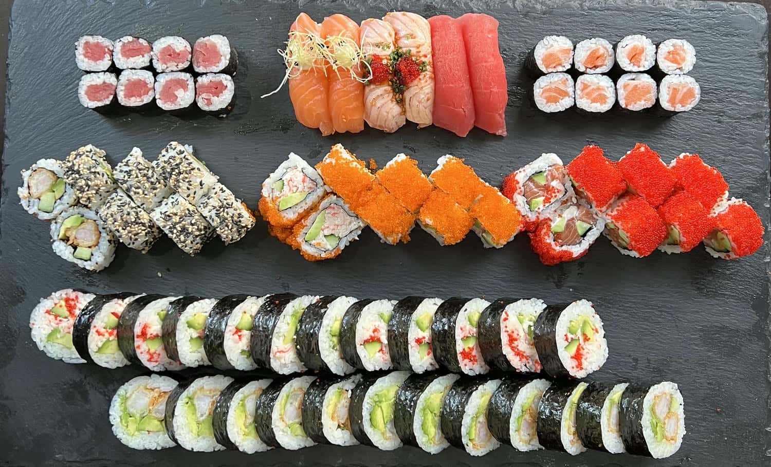 2 stk. laks nigiri, 2 stk. tun, 2 stk. rejer, 2 stk tufo. 2 stk hvidfisk